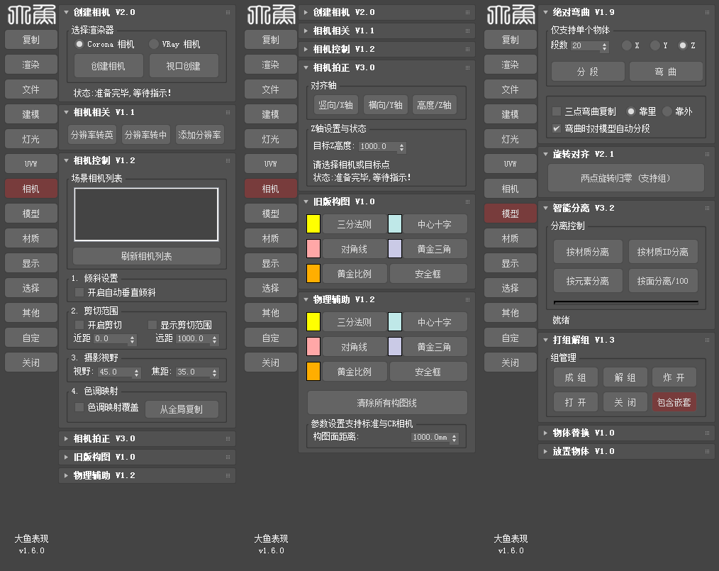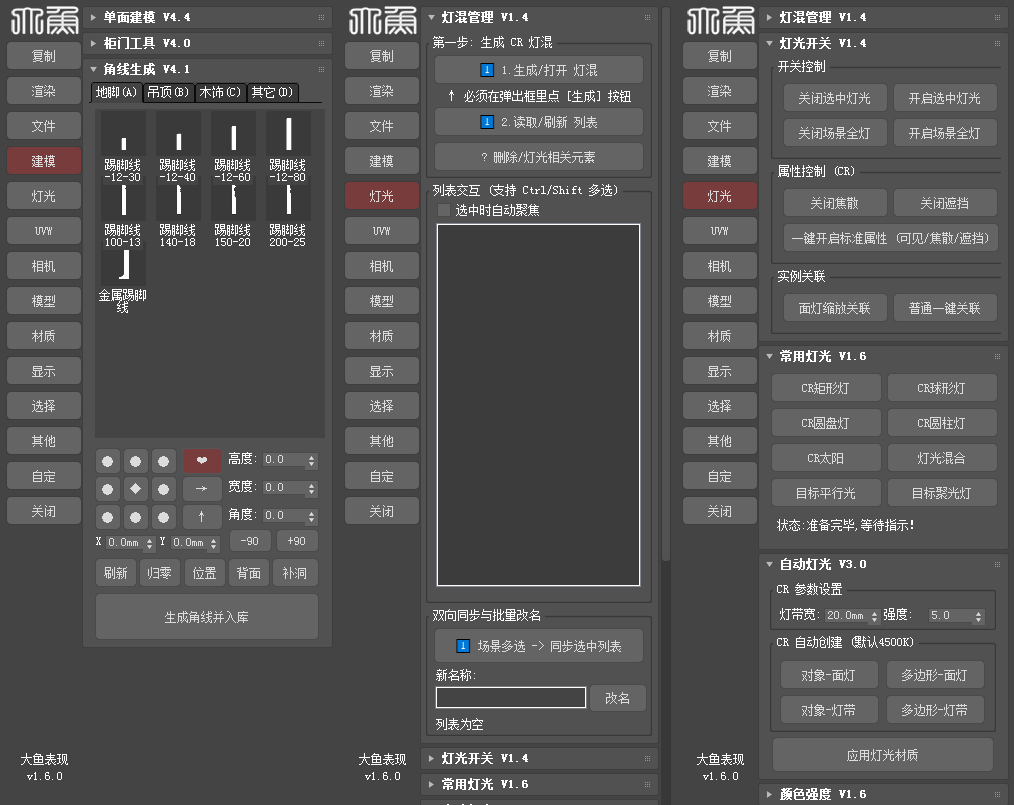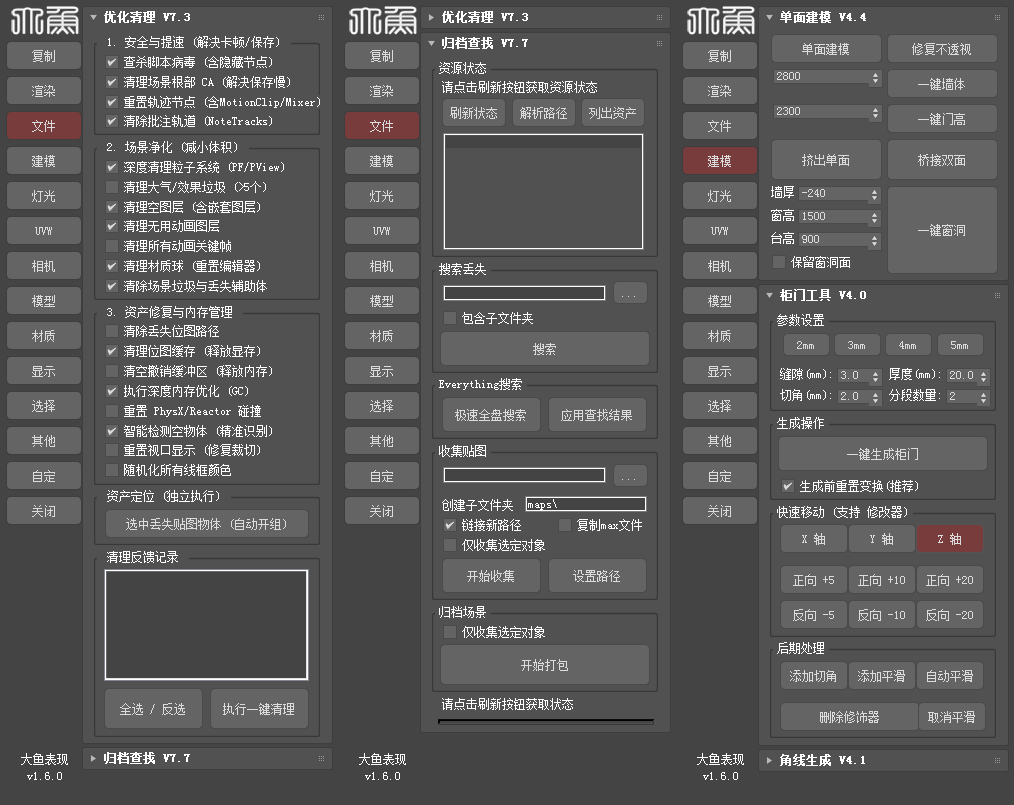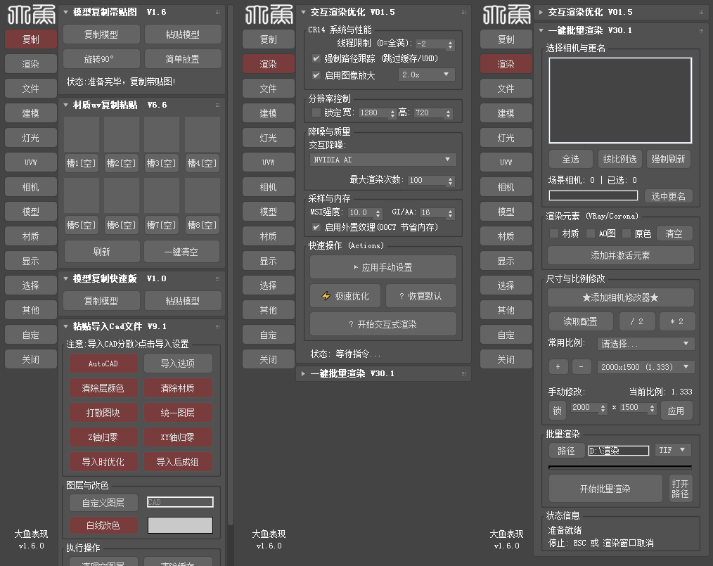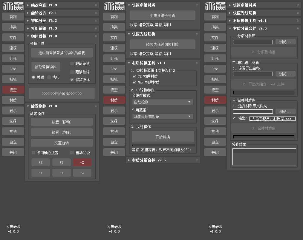 - 材质:快速多维材质,快速光线材质,CR物理转旧版,材质库分解合并炸开到场景物体