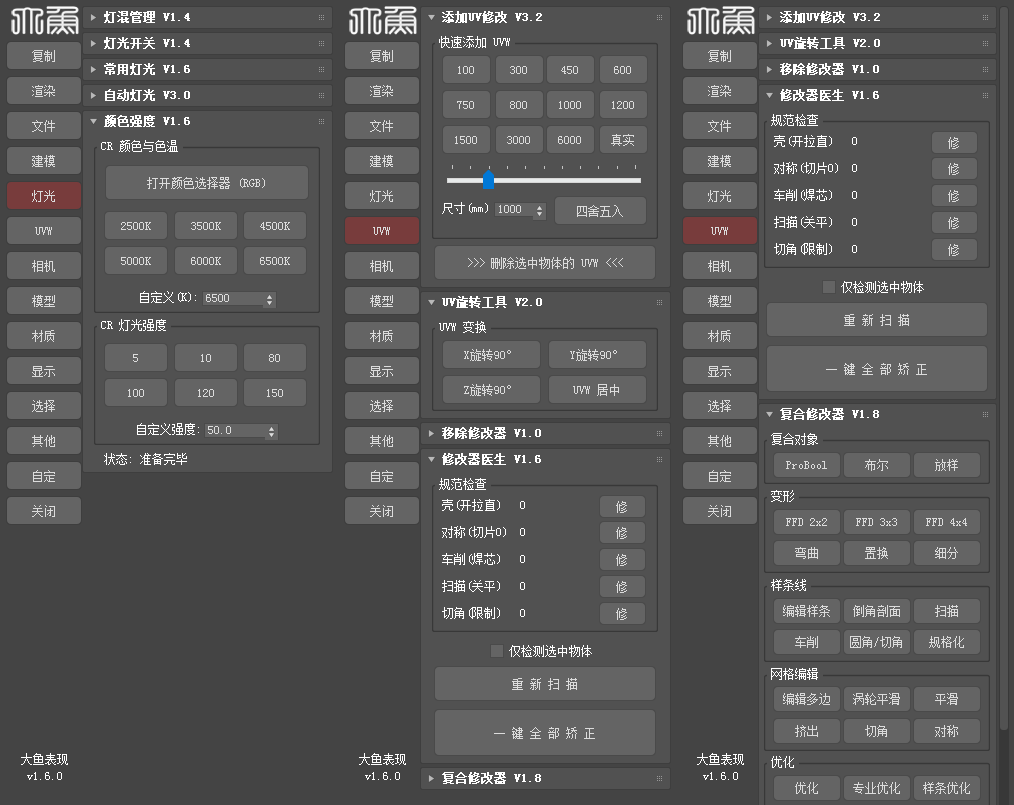 - uvw:批量移除/添加修改器,添加常用UVW,UV滑块,UVW旋转,修改器医生,常用修改器