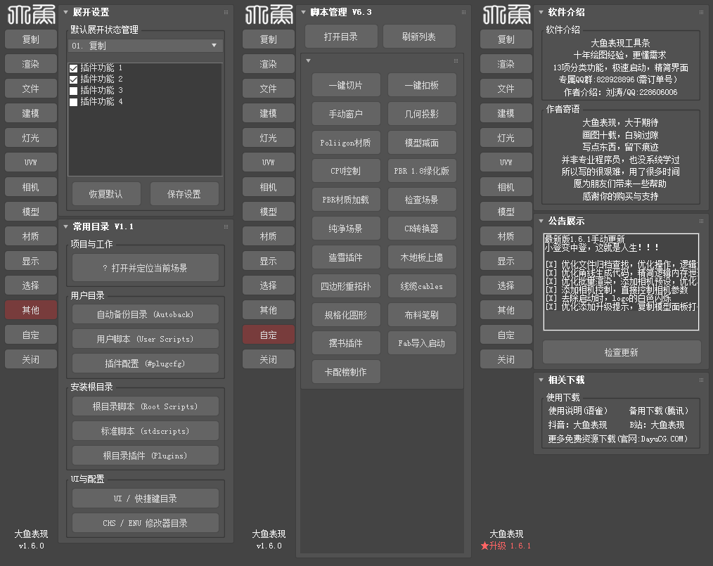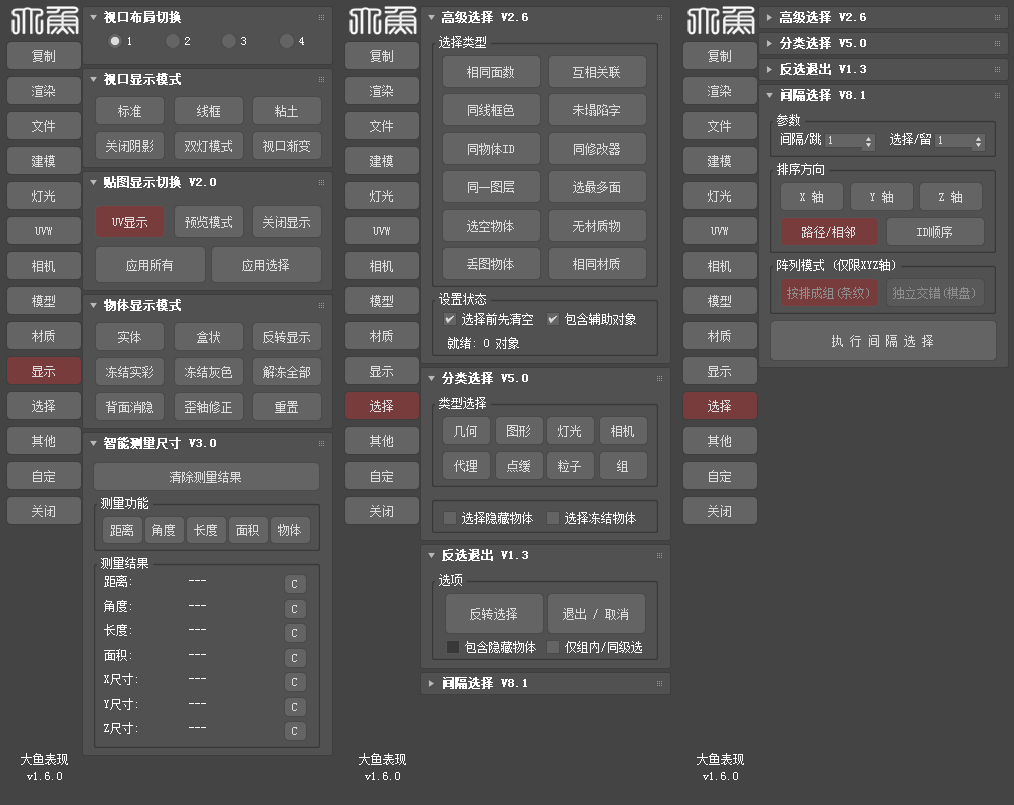 - 显示:视口布局切换,物体显示模式,贴图显示终极切换(可解决2024bug),五种物体测量